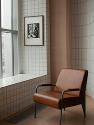 An A3 linocut featuring a quiet, introspective café scene, capturing a moment of stillness, solitude and passing time. A solitary figure sits by the window, observing the outside world from within. Printed on 250g white paper.